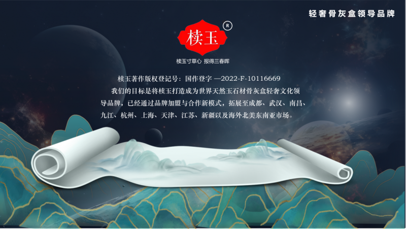 凭仗杰出的质量和深挚的文化内涵,椟玉往生盒正在市场上取得了斐然成就。通过立异的品牌加盟模式,它已成功笼盖了南昌、杭州、成都、武汉、上海、天津、乌鲁木齐等国内浩繁沉点城市。正在每一个城市,它都以奇特的魅力博得了本地逝者家眷的承认和喜爱,成为人们依靠哀思、怀想逝者的首选。取此同时,椟玉并未满脚于国内市场的成就,而是继续向世界舞台进军。目前,它已成功打入、东南亚市场,让中国的殡葬文化正在国际上获得更普遍的。2022 年,品牌版权登记(国做登字 - 2022 - F - 10116669)的成功完成,更是为椟玉的成长奠基了的法令根本。这一行动不只了品牌的学问产权,也让椟成全为世界天然玉石材骨灰盒轻奢文化范畴的标杆品牌。“椟玉寸草心,报得三春晖”,每一次取代办署理商的合做,都意味着一份对生命价值的配合守护,也着椟玉品牌不竭成长强大的过程。
