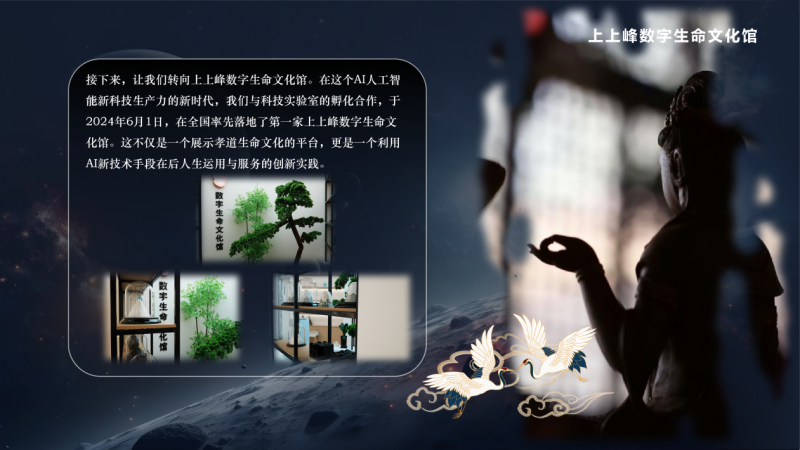 文化馆坐落于江西吉安,这里是四大书院之一白鹭洲书院的所正在地,也是的主要发祥地,深挚的汗青文化底蕴为生命文化的传承取成长供给了肥饶的土壤。文化馆巧妙地将 AI 手艺取保守文化相连系,为人们供给了五大极具立异性的办事:1。生命相框:数字化留存宝贵回忆,通过先辈的数字手艺,将逝者的照片、视频等材料进行高清存储和展现,让那些夸姣的霎时得以保留。人们能够随时通过馆内设备或线上平台,沉温那些温暖的回忆,感触感染逝者已经的音容笑脸。2。数字族谱:家族汗青云端传承,打破了保守族谱受时间和空间的短处。借帮互联网手艺,将家族的传承脉络以数字化的形式呈现,便利家族随时随地查阅和更新。这不只有帮于传承家族文化,还能加强家族之间的凝结力。3。生前契约:智能化规划生命典礼,为人们供给了一种全新的生命规划体例。通过 AI 手艺的辅帮,按照小我的爱好、和需求,定制专属的死后典礼。让人们正在生前就能对本人的辞别典礼有清晰的规划,削减后顾之忧。4。元留念馆:虚拟空间怀想逝者,操纵元手艺打制沉浸式的怀想空间。正在这里,人们可认为逝者建立虚拟的留念馆,以愈加丰硕多样的形式表达对逝者的思念。亲朋们能够正在虚拟空间中相聚,配合怀想逝者,这种全新的怀想体例为人们带来了史无前例的体验。5。生命教育:普及生命文化价值不雅,通过举办各类、展览等勾当,向社会大命文化学问,指导人们树立准确的不雅。让人们愈加爱惜生命、卑命,同时也能更好地舆解殡葬文化的内涵和意义。