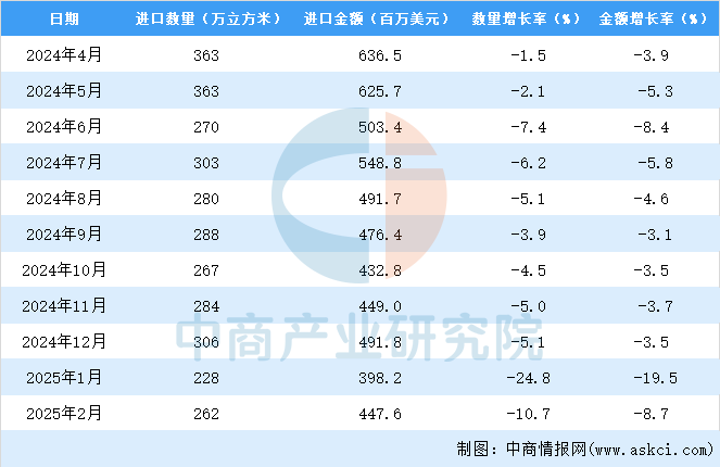 中商谍报网讯:据中商财产研究院数据库显示,2024年中国原木进口量3610万立方米,同比下降5。1%。最新数据显示,同比下降10。7%。数据显示,2025年1-2月中国原木进口金额845。9百万美元,同比下降8。7%。