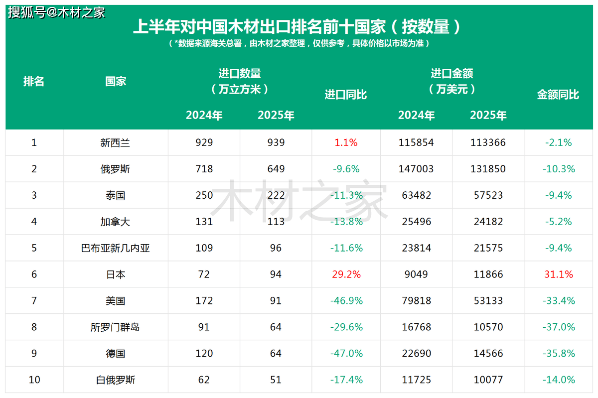 上半年对中国木材出口前十的国度别离为、泰国、、巴布亚新几内亚、日本、美国、所罗门群岛、和白俄罗斯。此中,对我国木材出口增加1。1%至939万立方;而日本则是增加了29。2%至94万立方。