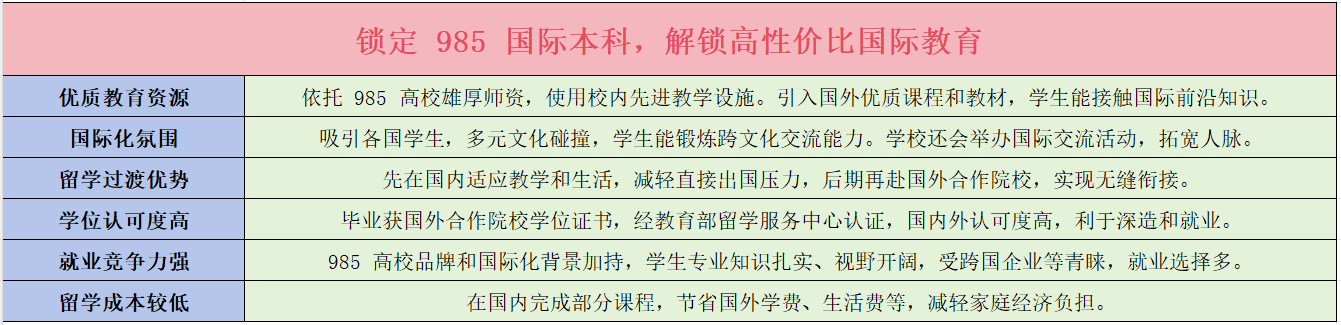 选择985高校国际本科项目,就是选择一条打破常规、实现逆袭的不凡之。正在这里,你将收成的不只是名校学历,更是一段并世无双、影响终身的进修履历。不要让临时的低分障碍你前进的脚步,抓住这个罕见的机遇,为本人的将来创制无限可能!